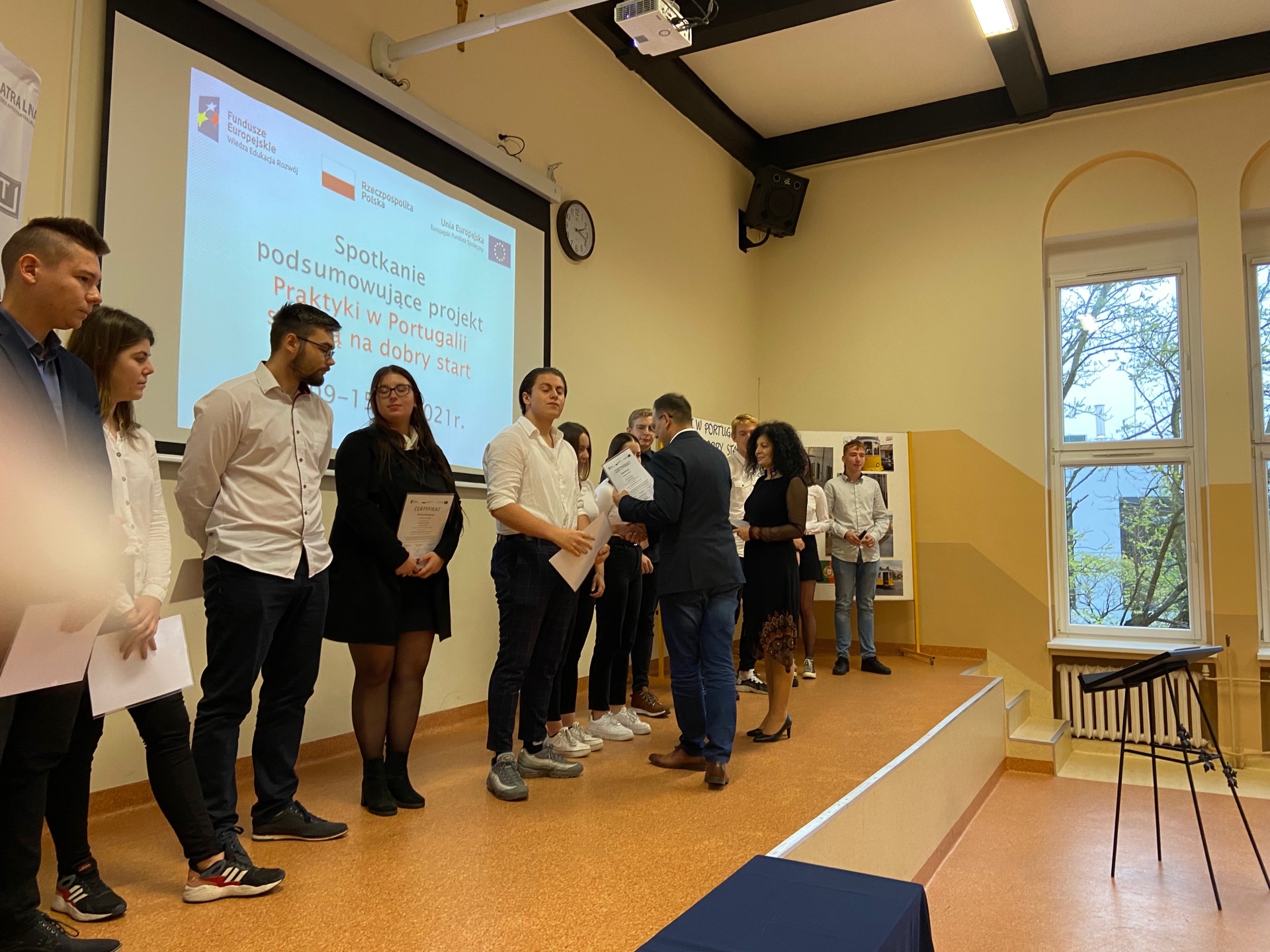 Dnia 16.11.2021 r. miała miejsce uroczystość wręczenia certyfikatów i dokumentów Europass - Mobilność uczniom, którzy odbyli praktyki zawodowe w Lizbonie w ramach projektu „Praktyki w Portugalii szansą na dobry start”.