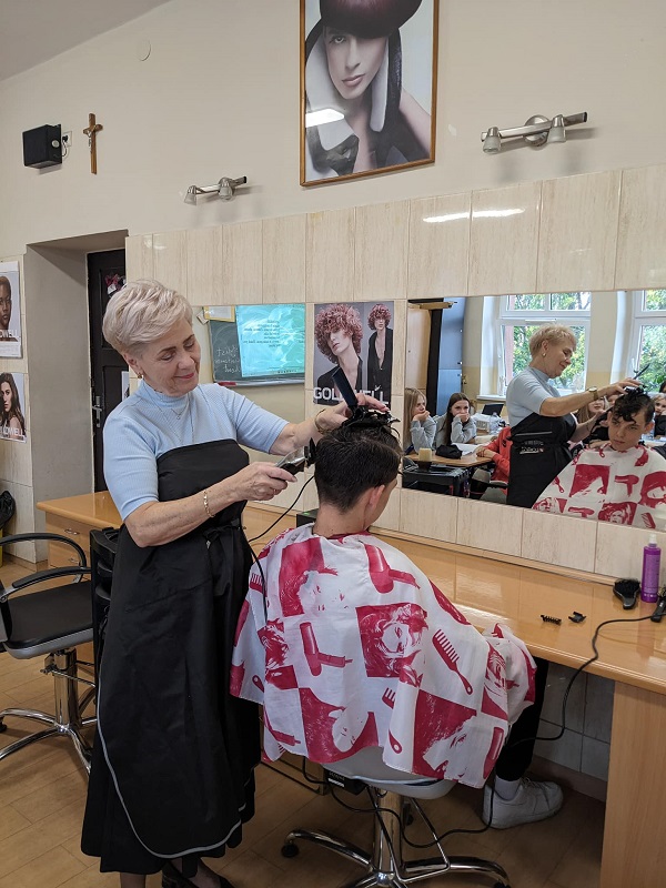 Dnia 2 października 2024r. w sali 208 odbyła się lekcja języka angielskiego i stylizacji „At the hair salon”. W zajęciach wzięli uczniowie klasy 2za, którzy tego dnia mogli obserwować oraz brać czynny udział w procesie strzyżenia męskiego, nazywać po angielsku poszczególne jego etapy oraz próbować swoich sił w odgrywaniu dialogu między stylistą a anglojęzycznym klientem salonu fryzjerskiego.